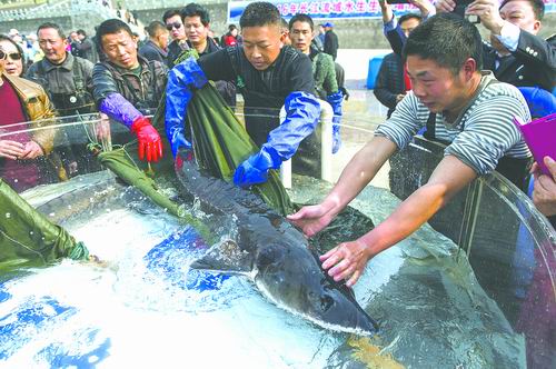 3月1日,在湖北宜昌,工作人员准备将一尾中华鲟放流长江。