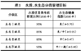 水生态环境功能分区管理目标分期考核,近期(2020年以前)以水质、水生态健康、生态红线、土地利用和目标总量控制等为主要考核指标,水陆统筹提升水环境质量,促进水生态系统健康。远期(2021年~2030年)将水环境容量总量、生物毒性、物种保护等纳入考核指标,全面保障流域水生态系统健康。