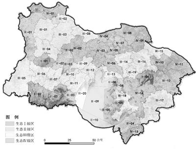 生态保护与生态修复并举原则。对水生态环境功能实行分区分级管控,划分生态Ⅰ级区(健全生态功能区)、生态Ⅱ级区(较健全生态功能区)、生态Ⅲ级区(一般生态功能区)、生态Ⅳ级区(较低生态功能区),实施差别化的流域产业结构调整与准入政策。对生态Ⅰ级区、Ⅱ级区重点实施生态保护,对生态Ⅲ级区、Ⅳ级区重点实施生态修复。