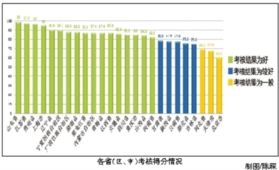总的来看,《规划》确定的各项目标任务基本完成,各省份均通过重点流域水污染防治专项规划2015年度实施情况考核。其中,山东省、江苏省、贵州省、上海市、辽宁省、宁夏回族自治区、广西壮族自治区、湖南省、黑龙江省、内蒙古自治区、青海省、江西省、安徽省、四川省、重庆市、山西省、河南省等17个省(区、市)考核结果为好。甘肃省、陕西省、云南省、湖北省、吉林省考核结果为较好,河北省、天津市、北京市考核结果为一般。从具体得分情况来看,山东省考核得分最高,为99分,北京市得分最低,为60.1分。