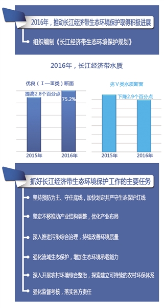 陈吉宁指出,过去一年,环境保护部和沿江省市深入贯彻习近平总书记重要讲话和指示批示精神,开展一系列专项行动,推动长江经济带生态环境保护取得积极进展。环境保护部全面启动各项工作,推动实施长江经济带大保护战略,组织编制《长江经济带生态环境保护规划》;推动、指导沿江11省(市)将长江经济带内重点生态功能区、生态环境敏感区和脆弱区等区域全部划入生态保护红线;全面开展长江流域水质监测,“十三五”时期将实现所有跨界(省界、市界)水体开展联合监测;开展沿江饮用水水源地环保执法专项行动,推动126个地级以上城市完成全部319个集中式饮用水水源保护区划定。长江经济带沿线各省(市)加强协调联动,初步形成齐抓共管工作合力,共同推动长江经济带生态环境保护工作取得积极进展。2016年,长江经济带水质优良(Ⅰ~Ⅲ类)断面比例为75.2%,比2015年提高2.8个百分点,劣Ⅴ类水质断面下降2.9个百分点。但同时,长江经济带生态环境保护形势依然紧迫而复杂,仍面临流域系统性保护不足,生态功能退化严重;污染物排放量大,饮用水安全保障任务艰巨;沿江化工行业环境风险隐患突出,守住环境安全底线压力大;部分地区城镇开发建设严重挤占江河湖库生态空间,发展和保护矛盾凸显等问题和挑战,需要长期持续努力。