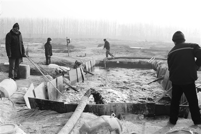 寒冬中,深泽县滹沱河段部分水面已经结冰,但岸上却一派热火朝天。采访中,记者看到,吸沙泵将墨汁一样的泥水源源不断地抽入反应池,池边工人们不停地将灰白色药剂投入池中,在机器搅动下,底泥和着污水经过短短12米路程,在水池另一头变成了清水,被水泵抽回河中。