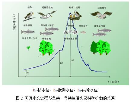 (3)洪水脉冲的信息流功能。洪水水位涨落也会引发不同的行为特点(behavioral trait),比如鸟类迁徙、鱼类洄游、涉禽的繁殖以及陆生无脊椎动物的繁殖和迁徙(图2)。每一条河流都携带着生物生命节律信息,本身就是一条信息流。在洪水期间洪水脉冲传递的信息更为丰富和强烈。观测资料表明,鱼类和其他一些水生生物依据水文情势的丰枯变化,完成产卵、孵化、生长、避难和迁徙等生命活动(图2)。在巴西Pantanal河许多鱼种适应了在洪水脉冲时节产卵[4]。在澳大利亚墨累-达令河如果出现骤发洪水,当洪水脉冲与温度脉冲之间的耦合关系错位,即洪峰高水位时出现较低温度,或者洪水波谷低水位下出现较高温度,都会引发某些鱼类物种的产卵高峰[5]。另外,依据洪水信号,一些具有江湖洄游习性的鱼类或者在干流与支流洄游的鱼类,在洪水期进入湖泊或支流,随洪水消退回到干流。我国国家一级保护动物长江鲟主要在宜昌段干流和金沙江等处活动。长江鲟春季产卵,产卵场在金沙江下游至长江上游。在汛期,长江鲟则进入水质较清的支流活动[6]。