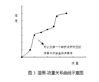 水文水力学方法主要通过流量、水位等参数反映河流栖息地的状况,如湿周法(15,16,17)、R2CROSS法(18,19)等,在计算河道生态需水量时也通常采用这类方法(20)。河道湿周法假设浅滩是最临界的河流栖息地类型,保护了浅滩也就保护了其它栖息地类型。在应用中,首先要在浅滩区域选定几个代表性断面,测量不同流量条件下的水深和流速,然后绘制湿周与流量的相关曲线,二者是非线性关系,湿周随着流量的增加而增大,但当湿周超过某临界值后,关系曲线斜率降低,可认为湿周-流量关系曲线中的第一个转折点所对应的流量为河道生态流量值。如图3所示。R2CROSS法将河流平均深度、平均流速和湿周率作为反映生物栖息地质量的水力学指标,认为如能在浅滩类型栖息地保持这些参数在适宜的水平,即可维护鱼类在河流内的水生栖息地(21)。