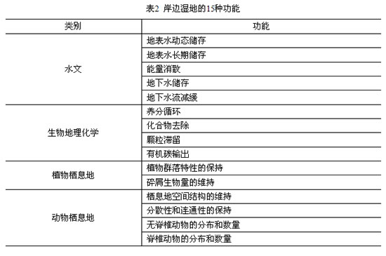 美国陆军工程兵团水道实验站(53)利用水文地貌方法(Hydrogeomorphic, HGM)从水文、生物地理化学、植物栖息地、动物栖息地四个方面归纳了河岸湿地(Riverine Wetland)的15种功能(表2),并利用功能指数对岸边湿地栖息地的状况进行评价。在澳大利亚,进行栖息地评估的综合性方法包括AUSRIVAS方法、河流条件指数(Index of Stream Condition)、以及河流状态调查(State of the Rivers Survey)/河流栖息地调查程序(River Habitat Audit Procedure)等(54,55)。AUSRIVAS是基于英国河流无脊椎动物预测方法和分类系统(RIVPACS)开发的栖息地评估方法(56,57)。AUSRIVAS方法利用大型无脊椎动物对栖息地状况进行评估,从干扰最小的若干参考点采集大型无脊椎动物的信息,然后根据生物信息的相似性将参考点进行分类。利用在参考点采集的物理化学数据对生物群进行辨别,然后选取具有最强辨别力的变量作为指示变量,最后利用根据参考点信息所形成的模板进行河流栖息地状况的评估。河流条件指数方法利用分级系统对栖息地状况进行打分,其所考虑的因素包括水文、物理形态、岸边带、水质、生物信息等,每个因素又包括若干指示变量。河流状态调查/河流栖息地调查程序将流域分为若干个整体河段(Segment),并且从整体河段中选取代表性的局部河段(Reach),在每个局部河段上,利用水文、植被类型、土地利用、栖息地类型、河道横断面、河道岸坡特征、河流底质、美学价值因素对栖息地进行评价。