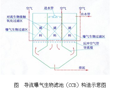 导流曝气生物滤池(CCB)是一种典型的高负荷、淹没式、固定化生物床的三级、三区、三相导流、活性污泥外排及回流的三相导流、脱氯除磷反应器。在连续进水的条件下实现间歇曝气、快速过滤、悬浮物截留、两曝两沉、无泵污泥回流、定期反冲于一体。兼有下向流曝气生物滤池法、上向流曝气生物滤池法、SBR法、AB法、接触氧化法、生物膜法、人工快滤法、沉降分离法、无泵污泥回流法、给水快滤等十者的优点。是活性污泥法、生物膜法、物理处理法的典型有机结合体。通过生物氧化、生物吸附、生物过滤、沉降分离、脱氮、除磷,处理后的水质优于国标,达到中水回用。