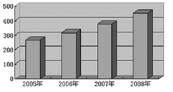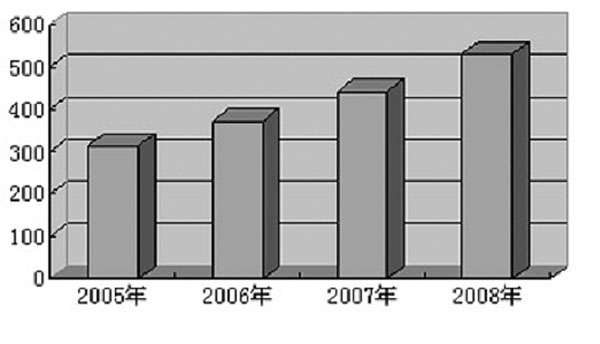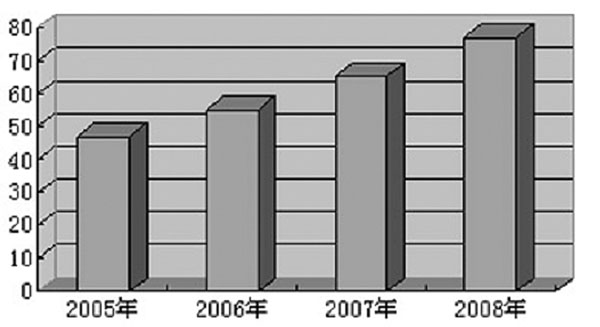 对于中国循环水系统治理和水资源综合治理行业市场规模来说,2005年为315.2亿元,到2008年达到530.4亿元,增长速度持续提升(图二)。其中,循环水系统治理行业市场规模由2005年的47.2亿元增长到2008年的77.0亿元(图三、图四)。