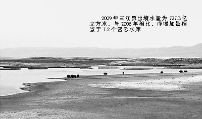 青海省水文水资源勘测局信息中心副主任李德靖介绍,今年5月以来,长江上游各水文站观测到降水比往年偏多四到六成,而黄河大部分站要多五到八成。2009年三江源出境水量为727.3亿立方米,比2006年净增加了315亿立方米,约相当于7.2个密云水库。