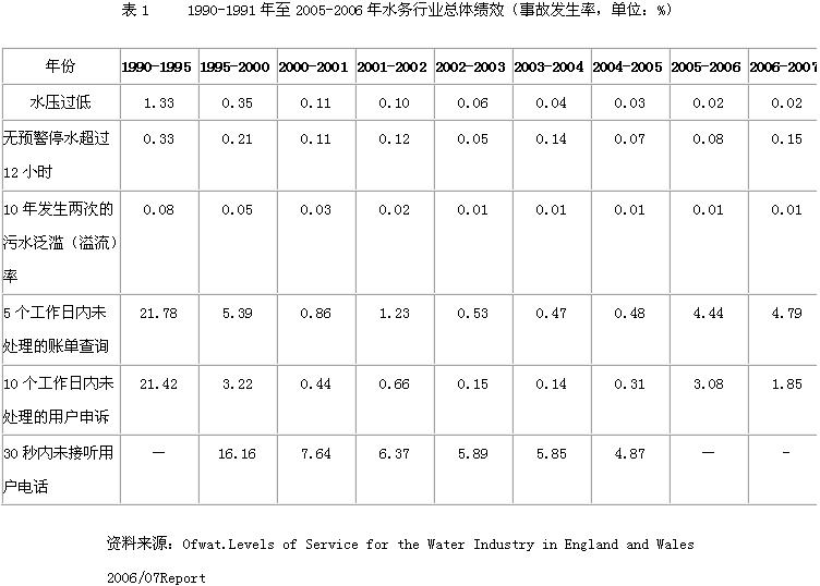 (5)水务公司客户服务质量大为改观,行业总体绩效明显提高,供水水压过低现象明显减少,断水率比私有化前大大减少,污水溢流率降低,用户服务逐步完善,用户账单查询和申诉等能够得到及时处理(表1)。