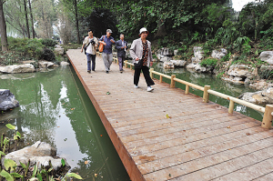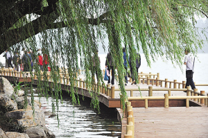 出新后的玄武湖,无论是环湖路还是五大洲,均在“亲水 ”上下了大工夫。昨天记者在玄武湖看到,本次改造不仅在五洲内沿着湖边增加了多处亲水平台,而且在翠洲门和解放门附近的水面上改建了旭桥和旱桥,沟通五大洲的水系。