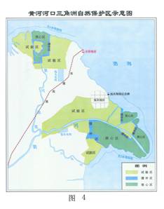 3、黄河年复一年地淤积延伸,滋生出大片完整的原生湿地,这也是我国目前最年轻的河口三角洲湿地。湿地总面积24.25万平方海里,其中自然湿地面积为18.58万平方海里,主要分布在东部和北部沿海地区,包括现清水沟流路与刁口河、挑河、沾利河、小岛河等入海口及其周围地区。河口湿地是维系河口生态系统发育和构成河口生态多样性的重要生态体系,是经国务院批准的中国唯一的国家级三角洲湿地重点自然保护区,也是国际缔约国要求注册的国际重要湿地。黄河河口地区生态功能分区见示意图(3),黄河河口自然保护区见示意图(4)。