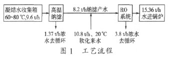 膜回收高温凝结水的工艺特征:耐高温膜元件(Duratherm);纳滤(NF)——除硬度和有机物;反渗透(RO)——去除残余含碳污染物、溶解性固体和金属;预处理——特殊设计组合过滤工艺,取决于具体水质;回收率80%~90%;热水系统设计,77 ℃。类似工艺流程见图1。