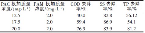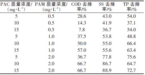 PAC 投加质量浓度分别为5、10、15 mg/L,PAM投加质量浓度分别为0.5、1.0、1.5、mg/L 条件下污水的COD、SS、TP 去除率情况见表1。