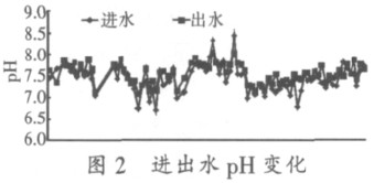 图2 是2008 年10 月3 日—12 月31 日气浮系统调试过程中进出水的pH 变化情况。