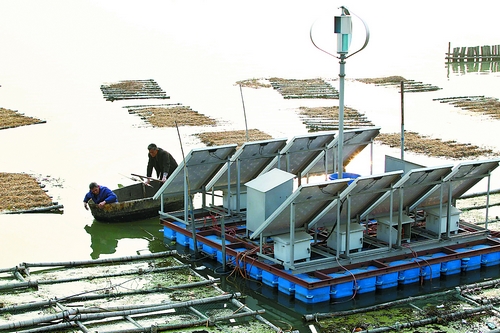 利用风能、太阳能工作的水质强化净化装置和“生态浮床”能有效地净化水质。