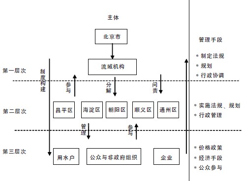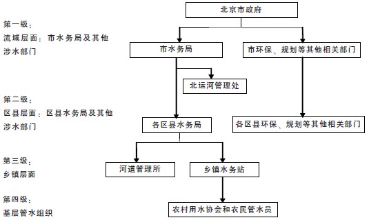第一级,市水务局。水务局为北京市政府组成部门,全市水资源的保护、管理、调度、利用等涉水事务统一由市水务局管理,是北运河流域层面的管理机构;北运河管理处是市水务局局属单位,具体履行对北运河流域水资源的监管职责。第二级,区县水务局。区县水务局由市水务局实行业务领导,统管区县行政区划内的水资源保护、管理、调度、利用等涉水事务。第三级,乡镇水务站和河道管理所。按乡镇或水系建立基层水务站或管理所,负责管理水资源、河道、水环境、用水、节水、治污等工作。第四级,农村用水协会和农民管水员对农村小型水利建设、农民用水进行管理。其他涉水相关部门还包括市区两级的环保局、发改委、国土资源局、规划局、农业局等相关单位。