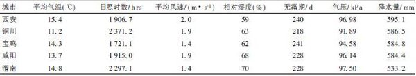 关中地区属暖温带半干旱气候, 处于我国东南湿润地区到西北干旱地区的过渡带, 年平均气温11℃~13℃, 7 月平均气温在25 ℃以上,1月平均气温-2℃左右, 高于10℃的积温为4 000℃ ~4500℃, 无霜期200~220 d, 年蒸发量900~1200mm。冬季多北风, 夏季多南风, 年平均风速2.2~2.7m/ s, 关中5 市基本气候情况见表1。