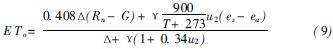式中: ETo——参考作物蒸散量(mm/ d) ; Rn——作物表面净辐射[MJ/ ( m2·d) ] ; G——土壤热通量[MJ/ ( m2·d) ] ; T——距地面2 m高处气温(℃); u2——距地2 m高处风速(m/s) ; es——饱和水汽压(kPa) ; ea——实际水汽压(kPa) ;△——饱和水汽压与温度曲线斜率(kPa/ ℃)——; γ——湿度计常数(kPa/℃) 。