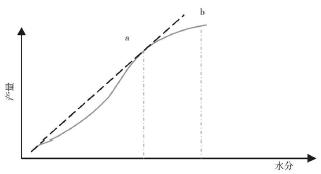 需要着重指出的主要有两点, 一是农作物经济需水量。一般研究认为作物产量随着水分的增加先增加而后减少, 傅国斌等分析其变化过程后认为, 作物产量与水分之间的变化关系分为3 个阶段(如图5 所示) , 首先产量随水分增加而明显增加, 第二阶段仍是增加但增加的幅度明显减小, 最后随着水分增加而降低。通常所说的作物需水量主要指产量达到最大时(拐点b 处) 的需水量, 但现在很多研究者都认同的观点是认为应追求在水分利用效率达到最大时的需水量, 即曲线上拐点a 处的水量。