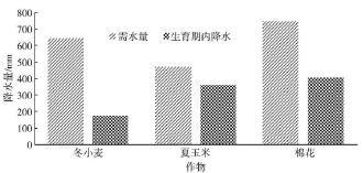 由图中可知, 冬小麦需要补充的水量最多, 降水量少和其生育期有关, 棉花的生育期最长, 其覆盖了整个汛期, 有效降水量最大, 但由于其作物需水量也很大, 其需要补充水量比玉米也要高很多, 反观玉米, 其需水量和降水量相当, 需要灌溉补充水量最少。