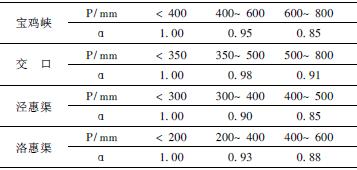 有效降水和一次降水量、降水强度、降水历时、土壤的质地、结构、作物种类以及田间条件如耕种方式、坡度等有关。关于降水有效利用系数, 冬小麦生育期处于10月至次年6月初, 期间逐日降水量都较小, 一般不发生暴雨, 降水入渗深度多年平均在1 m以内, 即使有超过1m的由于小麦根系较深也会被有效利用, 因此对于关中绝大多数地区冬小麦生育期内降水有效利用系数都在1.00 左右, 宝鸡市平均取0.98, 西安市平均取0.94, 其他3 市取1.00。各地作物生育期内降水有效利用系数最好是通过实验测定得出, 本文采用陕西省水利厅和西北农业大学1991 年利用多年观测作物生育期内降水和有效降水统计数据计算得出的系数值[14]。各站的!值见表4 和表5。