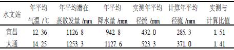 根据实测数据计算公式(1)中的各项(见表1)。本文中的经验方程以年平均值为研究对象,虽然长江流域上游修建了特大型水利工程三峡水库,但其是季节调节水库,在年际尺度上对径流量影响不大,因此经验方程主要反映气候变化对多年平均径流均值影响,未考虑年内水库调度对径流量时间分配改变的影响。