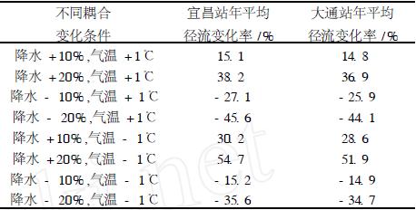 从表2 可知,对宜昌、大通站分别控制的流域而言:当气温增加1℃时,降水增加对年平均径流的影响并不呈线性关系,降水增加20%对年平均径流的影响比降水增加10%对径流影响的2倍还要大;当气温增加1℃时,降水减少对年平均径流的影响也不呈线性关系,降水减少20%对年平均径流的影响比降水减少10%对径流影响的2倍要小;当气温减小1℃时,降水增加20%对年平均径流的影响比降水增加10%对径流影响的2倍要小;当气温减小1℃时,降水减少20%对年平均径流的影响比降水减少10%对径流影响的2倍还要大。也就是说,当气温增加相同量值时,若降水增加幅度越大,则年平均径流量增加越大;若降水减少幅度越大,对年平均径流量的影响则逐渐变小。当气温减少相同量值时,若降水增加幅度越大,对年平均径流量的影响则逐渐变小;若降水减少幅度越大,年平均径流减少幅度越大。