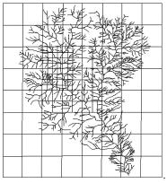 根据分形理论,要计算出水系的盒维数值,就要将研究区域划分为多个方格,而且要不断的变换研究区域内小方格的尺寸,计算出不同尺度下被占用的方格数,将其与尺度指标对应,将数据作于双对数坐标上,方可求出盒维数值。