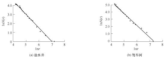 无标度区间是分形几何中非常重要的指标,水系的无标度区间可以这样判断。图4所示是研究对象中的盐水井和驾车河两条泥石流沟水系的曲线拟合情况。