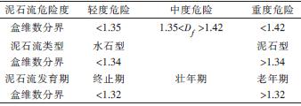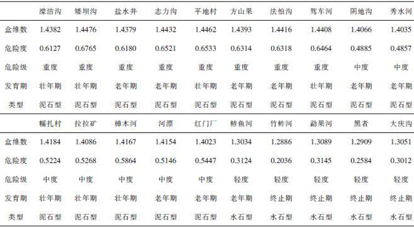 从图7中的各项特征值和盒维数的关系可以看出,水系的盒维数值与泥石流的危险度、发育阶段和类型均存在着明显的分界现象,其具体情况见表3。
