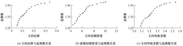为了讨论出现图5现象的原因,继续做出与水系形态相关的3种危险因子与水系盒维数之间的关系曲线(图6)。从图中的关系曲线可以得知,随着沟床比降、主沟弯曲系数和流域切割密度的增加,水系盒维数呈增长趋势,且当盒维数超过1.35和1.42这两个值时,各个参数的增长速率均比之前有所加快。也就是说,水系盒维数越大,该处山区沟道的比降越大,集水面积越大,流程越长,更加容易接纳沿途的松散固体物质,流域内岩体风化程度越大,沟道较容易堵塞。且当水系盒维数超过一个阈值时,流域内上述特征的演化速度就会提高一个层次,这时更大的主沟床比降和更丰富的支水系为泥石流的运动提供了足够的动能和物源,使得这些沟谷的泥石流相对更加频发,破坏力更大。而图5中曲线中的两个拐点也恰好出现在盒维数值为1.35和1.42的点上,从而证实了上述说法的合理性。另外,如前所述,水系盒维数值与水系分布特征的关系也可以从侧面证实该结论的正确性。