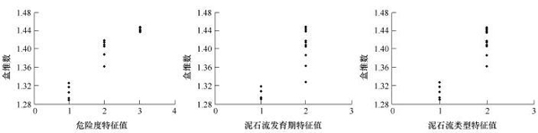 首先分析上述20条泥石流沟的水系盒维数与其危险度的直接关系(曲线见图5),继而统计各泥石流沟的水系分布参数:流域切割密度、主沟弯曲系数以及沟床比降,将它们依次与水系盒维数进行比较。其中流域切割密度是流域内水系的总长度与流域面积之比,综合反映了流域内岩石的风化程度,也反映出流域产沙情况及汇流状况;主沟弯曲系数是主沟实际长度与主沟直线长度之比,该指标反映出沟道堵塞难易状况及对泥石流流量的影响状况;沟床比降定义为流域相对高差与主沟长度之比,该指标反映了流域的大小,决定着流域的流程长短以及沿途接纳松散固体物质多少的可能性。水系分布参数与盒维数的分布曲线见图6所示。为了更直观的观察水系的盒维数和泥石流各种特征之间的关系,将危险度、泥石流类型和泥石流发育期的各级别赋值,并做出赋值与盒维数的关系图,具体赋值情况见表2,因为观察到老年期和壮年期的泥石流盒维数没有明显的分界限,壮年期和老年期的泥石流均赋值为2,其中泥石流的各特征值与盒维数的关系见图7。