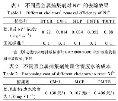 Ni2+浓度为1.0 mg·L-1的模拟废水,pH值调为8.0.因为根据Ni(OH)2的溶度积计算,pH>8.7时Ni2+产生沉淀,而且传统化学沉淀出水一般为碱性.分别用DTCR、MCP、TMTB、TMTF及CM-1重金属捕集剂对模拟废水进行处理,捕集剂投加量为各自理论投加量的1.2倍(所需的DTCR、CM-1、MCP、TMTB和TMTF的理论投加量分别为0.12、0.11、0.12、0.10 mL和0.10 mL,此数据由试剂供应商提供),实验结果见表1.由表1可知,CM-1、MCP和TMTB均能使含Ni2+废水达标排放,其中CM-1处理效果最好.