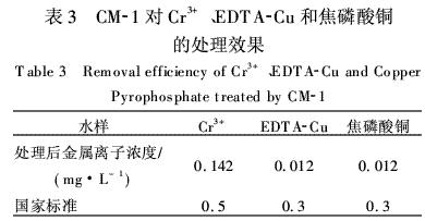 接着,用CM-1分别处理含Cr3+、EDTA-Cu和焦磷酸铜的模拟废水,水样中金属离子浓度均为1.0 mg·L-1,pH值为8.0,捕集剂投加量为1.2倍理论投加量,实验结果如表3所示.由表3知,在对含Cr3+、EDTA-Cu和焦磷酸铜的废水处理中CM-1同样表现出良好的去除重金属的性能.综上,CM-1是处理低浓度电镀废水的最佳选择.