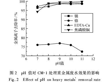 由图2分析可知,当pH值在7~9时,各金属离子的去除率均随着pH值的增大而增大;pH值继续增大时,Ni2+、EDTA-Cu和焦磷酸铜的去除率保持不变,而Cr3+的去除率反而下降.这主要是因为在pH值为7~9时,游离的金属离子以碱性沉淀的方式被去除;两性离子Cr3+在较高pH值条件下生成多羟基化合物,而CM-1可能对多羟基化合物的螯合沉淀能力较差,导致了去除率的下降.