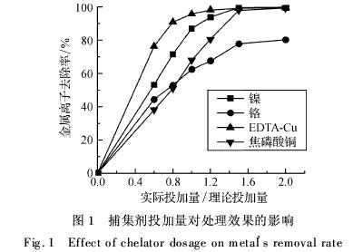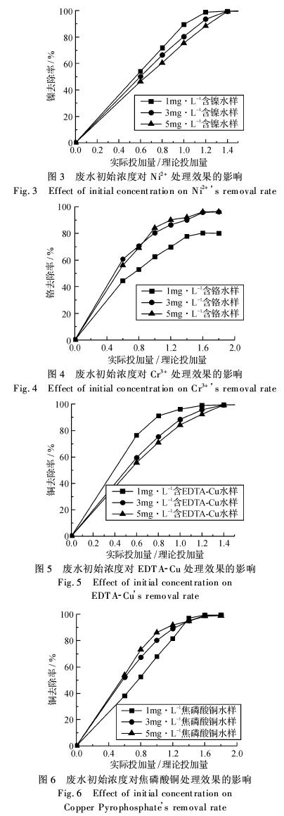 分析各图可知,对于Ni2+和EDTA-Cu,废水初始浓度为1.0 mg·L-1时,最佳投加量为理论投加量的1.2倍左右,初始浓度为5.0 mg·L-1时,最佳投加量是理论投加量的1.4倍左右,初始浓度为3.0 mg·L-1时,最佳投加量为理论投加量的1.2~1.4倍.类似,对于Cr3+和焦磷酸铜,其废水初始浓度为1.0、3.0、5.0 mg·L-1时的捕集剂最佳投加量分别为1.5倍、1.5~1.6倍和1.6倍的理论投加量.有废水需要处理的单位,也可以到污水宝项目服务平台咨询具备类似污水处理经验的企业。