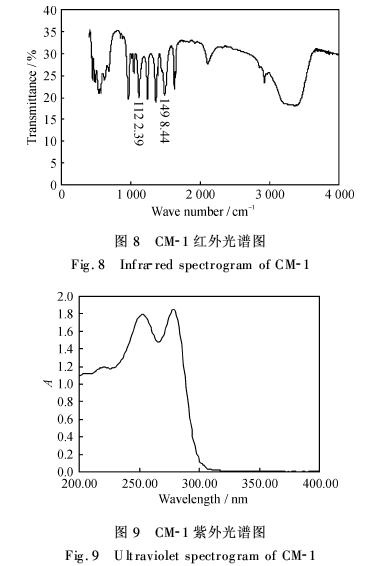在500~4 000 cm-1,对CM-1进行红外光谱测定,确定其主要官能团及物质类别.在200~400 nm,以水为溶剂,对CM-1进行紫外-可见光谱测定,进一步确定其类别.图8和图9分别是CM-1的红外光谱扫描曲线和紫外光谱扫描曲线.