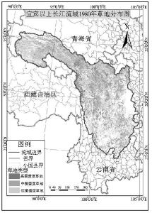 本区草地主要包含草甸草地和荒草地, 主要分布在调水工程区西部高原丘陵和东部高山上, 宜宾以上长江流域1980年草地面积约为4.067万km2, 见图2, 近年来受气候变化和人类干扰影响略有退化。