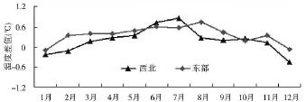 将研究区域分为两小块, 分别为研究区域西北区域(90~98°E, 28~36°N), 包括研究区域内的西藏和青海省部分、东部区域(98~105°E、2 4~36°N), 主要包括四川省和云南省。图6 表示的是草地退化试验和控制试验月平均气温差值分别在研究区域西北部和东部的面积平均值随时间的变化。可见,草地退化导致了研究区域冬季(12、1、2月) 地表温度的降低,而在其它季节(春、夏、秋季) 地表温度有明显升高。其中, 对于西北部靠近青藏高原腹地区域, 温度差值在夏季变化幅度较大,且在7 月温度升高0.86℃, 增幅为9. 26%; 在东部四川和云南地区, 温度差值也是在夏季变化幅度最大, 在8月温度升高0.73℃, 增幅为8.67%。总体来看, 草地退化后在西北部的地表温度变化幅度比东部要大。在西北和东部两个区域大部分月份都表现为温度上升, 升温较为显著季节为春季和夏季, 且温度升高的幅度比降低的幅度要大。