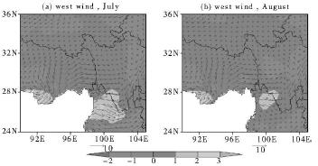 图4 为草地退化后1998年7月和8月的距地面10m处的西风分量的变化。可以看出草地退化后, 距地面10m处风场的变化不明显, 但西风分量有一定的增强, 增值中心高达3m/s。夏季环流场的这种变化将会使更多的暖湿气流进入研究区内, 从而使得研究区内的气温上升。产生这种现象的原因可能是草地退化使地表反照率增强, 从而增强感热输送, 促进了高原地区的局地对流。