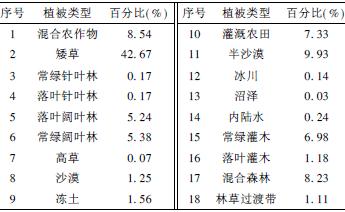 区域气候模式RegCM3中对不同下垫面的处理首先是根据地表的植被覆盖情况定义了20种土地覆盖类型, 并进一步根据土壤的质地分为12类, 颜色分为8个级别, 对不同的土地覆被类型定义了各种植被参数和土壤参数。表2 给出了矮草和半沙漠这两种土地覆被类型所定义的各种植被参数和土壤参数。下垫面覆盖类型的变化将改变地表的反照率、粗糙度、土壤含水量、植被覆盖度等下垫面参数, 从而影响地-气系统的能量平衡。但由于陆- 气间多种正、负反馈过程的同时作用, 使得土地覆被变化对气候场的影响十分复杂[12]。本研究所使用的土地覆被数据为美国地质勘测局的2%分辨率的GLCC资料, 其中位于研究区范围内的植被分布根据研究区的实际分布情况作了相应的修正,见表3。