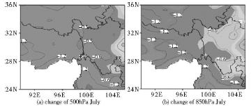 Fig. 3 Changes of the 500hPa and 850h Pa height field in July, 1998(unit: geopotential meter)