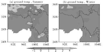 由图5 可见, 西线水源区草地退化对地表平均温度的影响在区域和季节是不一致的。从冬季(12月、1 月、2 月) 两组试验的对比结果看, 草地减少对冬季地表温度影响的结果在大部分区域表现为降温, 降温区域主要位于西北部的青藏高原地区, 降温幅度为0.2℃~0.3℃, 而东部地区的地表温度变化不明显。从夏季(6 月、7 月、8 月) 两组试验的对比结果看, 草地减少对水源区夏季地表温度的影响较冬季更为复杂。在北部的青海境内出现大范围的升温现象, 升温最高值达4℃; 而在西藏以及四川东部气温却有所降低。同时, 夏季地表温度的变化幅度也比冬季大: 其中北部地区的夏季增温可达4℃以上, 其它地区降温在0.5℃~ 1. 5℃之间。