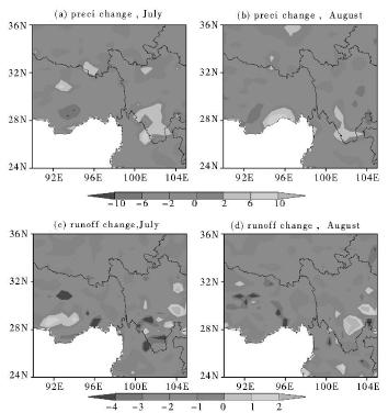 考虑到研究区的降水多集中在夏季, 这里主要分析草地退化对夏季降水的影响。图8为草地退化试验与控制试验模拟的1998 年7月和8月降水差值和径流深差值。由图可以看出, 草地退化后, 研究区夏季降水在不同区域的变化并不均匀, 但总体表现为减少, 其中减少最多的区域出现在四川东部和西藏南端, 最高减少10mm/d; 而在四川和云南交界地区、西北端的青海省内以及西藏的部分地区, 出现了降水增多的现象。夏季径流深的变化总体上与降水的变化呈现相似的分布型式, 即在大部分地区减少, 其中最高减少值为4mm/d。