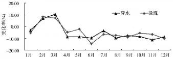 草地退化使研究区内的降水总体呈现减少的趋势, 区域年平均降水和径流深分别减少5.08%和4.83%。对于季节而言, 降水在夏、秋季减少最多, 分别减少7.50%和9.11%,春季次之, 冬季最少; 径流深变化的季节分布为夏季减少最多, 减少幅度为9.43%,秋季次之, 冬季减少最少, 而在春季径流深略有增加。图7为草地退化后区域平均各月降水和径流深的月变化曲线, 可见仅在2 月和3 月降水增加, 其余各月降水均减少, 径流深的变化与降水的变化表现出相似的规律。