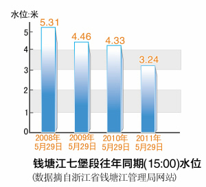 据浙江省钱塘江管理局网站发布的实时水位信息显示,从2008年数据上网开始,钱塘江杭州段同期水位逐年下降,今年仅为2008年同期的6成(见图二)。