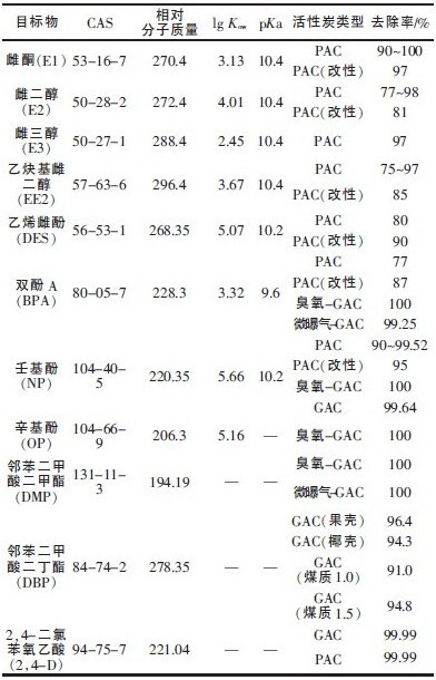 表1 几种内分泌干扰物的理化性质参数及活性炭吸附效果