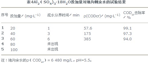 从表2可以看出,pH值在5.0~6.0范围内,反应时间最短,混凝效果较好。冲釜水的pH值为5.5,因而可不调节废水的pH值,直接投加Al2(SO4)3·18H2O。
