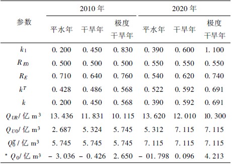 从生态和环境水质限制来看,2010 年极旱和2020 年干旱年份调水限制kT 值小于生态和环境质量达标所求k 值,说明这样年份南水北调分给郑州的规模合适,使得郑州市生态和环境容量还有容余量,生态和环境调入水规模还可以增大,分别为2. 650、0. 096 和4. 213 亿m3 。