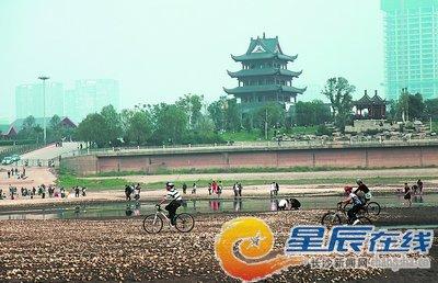 昨日下午,橘子洲公园西侧,几位市民在几近干涸的河床上骑单车。余志雄 邱晓峰 摄影报道